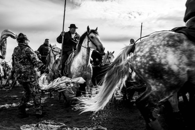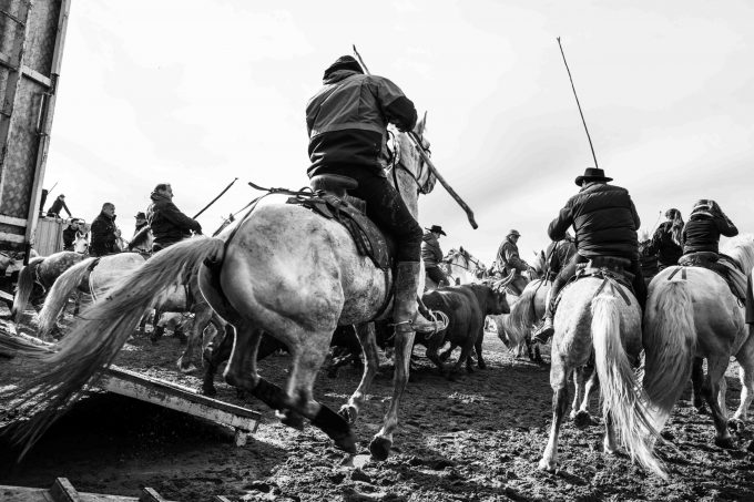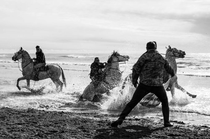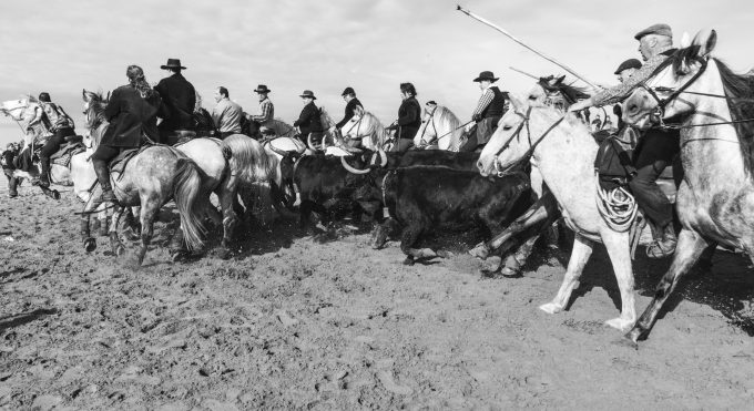 Gruppi di Gardians a cavallo conducono i tori di vari allevamenti per 6 km di spiaggia nel giorno di San Martino (protettore della Francia) e gruppi di disturbatori cercano di ostacolare i Gardians a cavallo durante il lungo percorso che li porta all’Arena del paese.