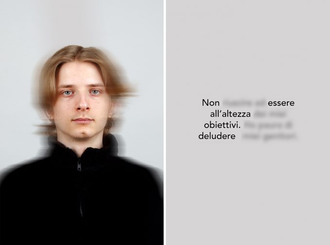 Il 20% sfocato – nei volti e nei fiori – suggerisce un movimento, un’instabilità, una porzione di realtà che ancora sfugge, che non si riesce a mettere a fuoco. Anche le parole che accompagnano i soggetti – sogni, paure, aspettative – appaiono sospese, frammenti di un’identità in trasformazione.