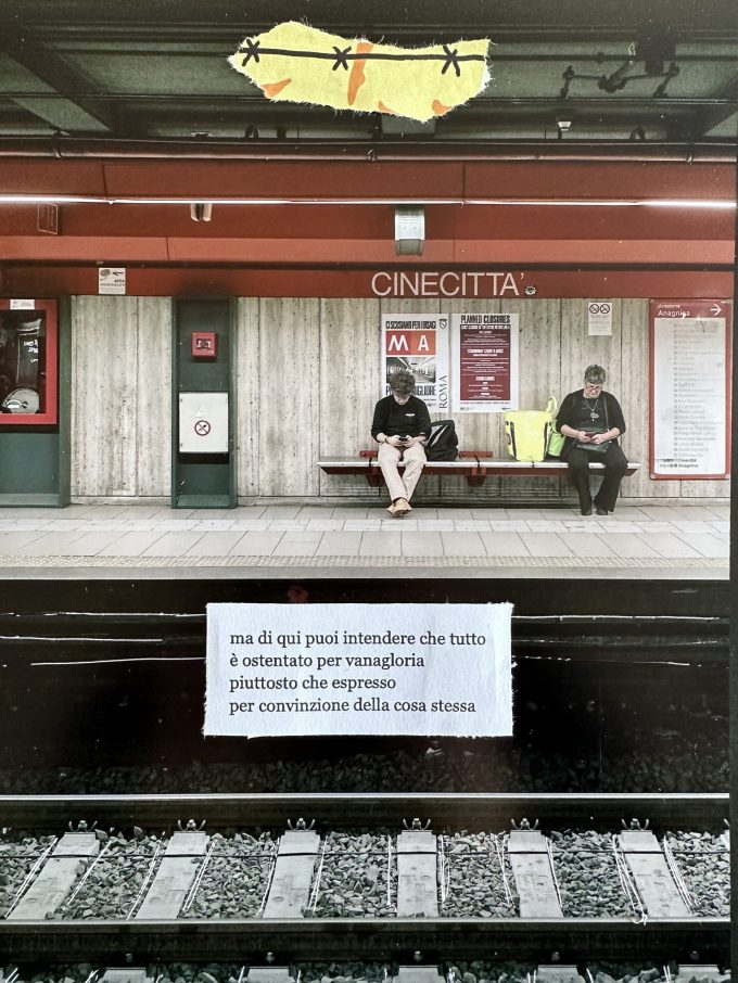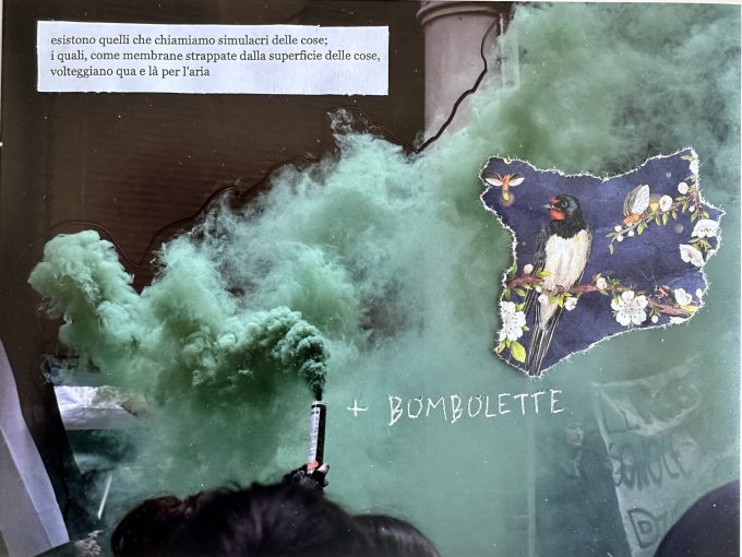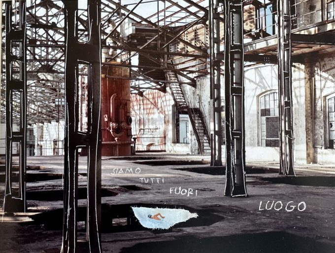 Le foto presentate di seguito, nei loro colori e nei loro spazi, sono il risultato dell’applicazione di molteplici tecniche a supporto della difficoltà di esprimere una complessità intrinseca. Graffi, collage, riferimenti e scritte fanno da patina ad un mondo ricco di fattori e complessità.