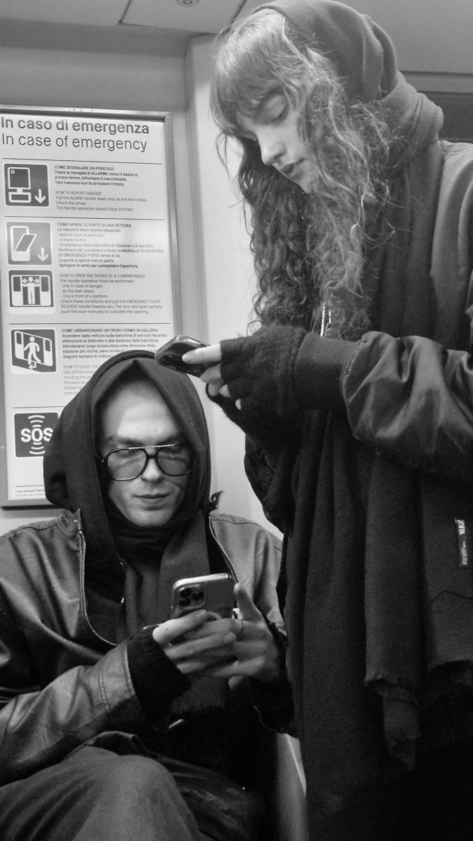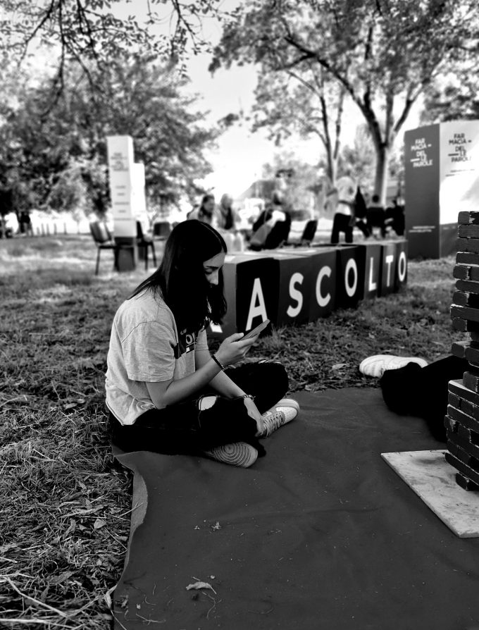 Ascolto è un progetto che nasce dalla spontaneità di un occhio critico capace di cogliere, da attimi di quotidianità, l’incapacità di mettersi in ascolto verso una generazione che sembra sempre più assente, nascosta dietro lo schermo di un cellulare. È una ricerca di occhi abbassati, di sguardi, di volti illuminati dalle luci pixel di un piccolo schermo che li tiene inchiodati a realtà parallele virtuali.